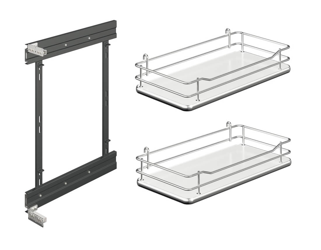 High-quality Häfele base unit front drawer with grid baskets or wooden shelves for mounting behind fronts / screwing onto the side panel and front. This drawer is not only particularly practical and space-saving, but also impresses with its high stability and comfortable operation. The solid base unit drawer is a true space miracle and effortlessly provides more storage space and comfortable access to stored items in the kitchen, bathroom, or living room. Robust hanging shelves made of steel and wood offer plenty of space for food, kitchen utensils, pots, etc., and also score points with long-lasting and high-quality craftsmanship and material selection. Solid full extension for base units and kitchen cabinets. The full extension with integrated damping allows for almost silent and smooth closing for absolutely comfortable operation. Universally usable: left and right.