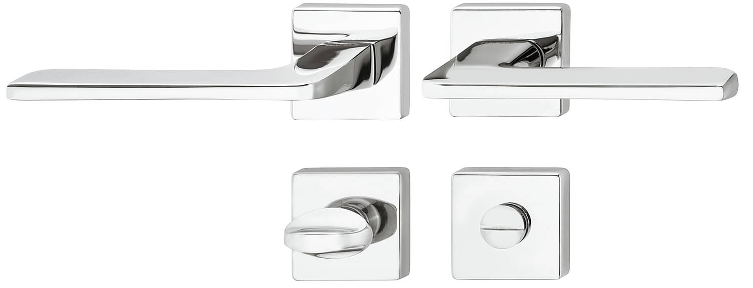 High-quality Häfele handle set LDH 3350 made of stainless brass with an elegant design surface and square rosette. This modern door handle convinces with exquisite and timeless design and high stability. The integrated return spring ensures a straight handle position and provides additional support for the door lock. Particularly clean and flawless workmanship for long durability of the door handles, the smooth surface is easy to clean and fingerprints are hardly visible.