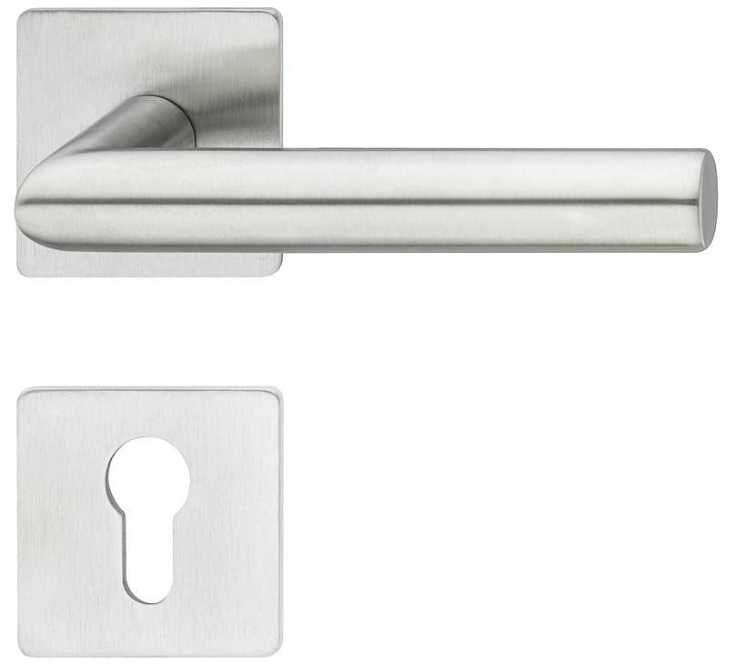 High-quality Häfele handle set model LDH 3171 with an elegant matte surface. Modern door handle made of stainless steel with square, flat roses for interior doors, side doors, bathroom doors, and more. Door handle with magnet-clip technology for the rose for a particularly slim design and quick installation. Absolutely flawless workmanship at the highest level for maximum stability and durability. These appealing door handles impress with stylish design and high quality. Mounting accessories for door thickness 37-42 mm are included for easy and uncomplicated installation. Standard: certified according to EN 1906:2012.