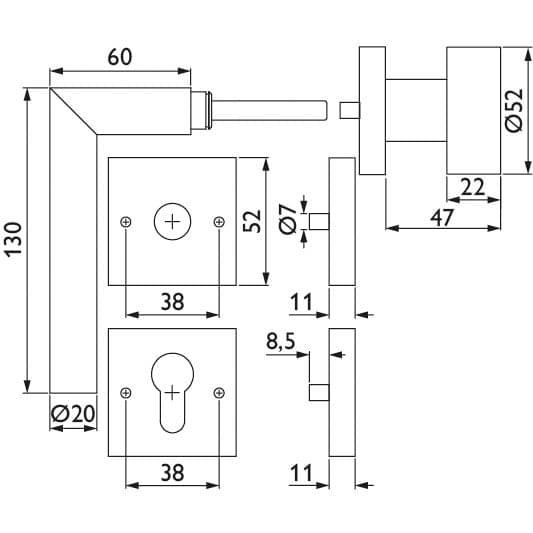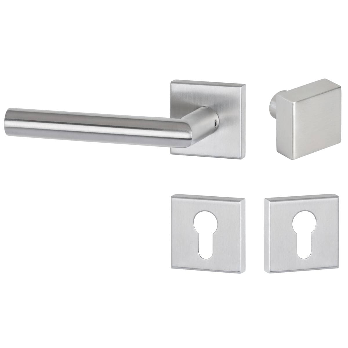 - 1 SET - lever handle set - (2 door handles incl. rosettes, 2 key rosettes incl. cover caps, 1 square spindle 8 mm for door thickness 37 - 47 mm, 1 compensation sleeve from 8 to 8.5 mm, 1 set of screws)
