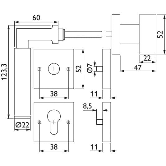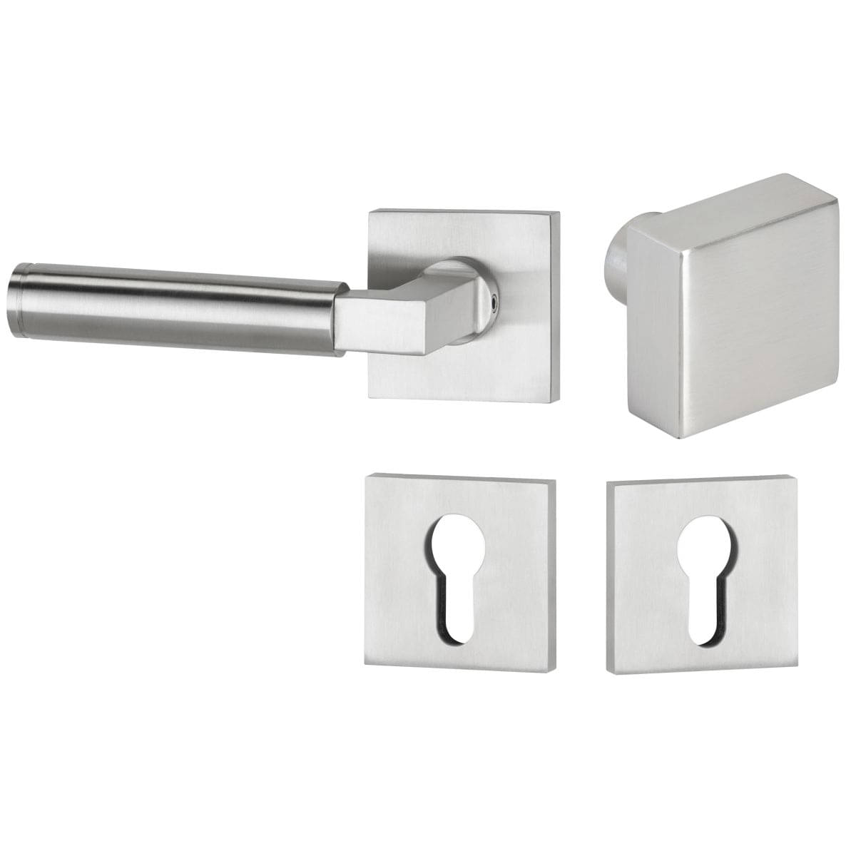 - 1 SET - lever handle set - (2 door handles incl. roses, 2 key roses incl. cover caps, 1 square spindle 8 mm for door thickness 37 - 47 mm, 1 levelling sleeve from 8 to 8.5 mm, 1 set of screws)