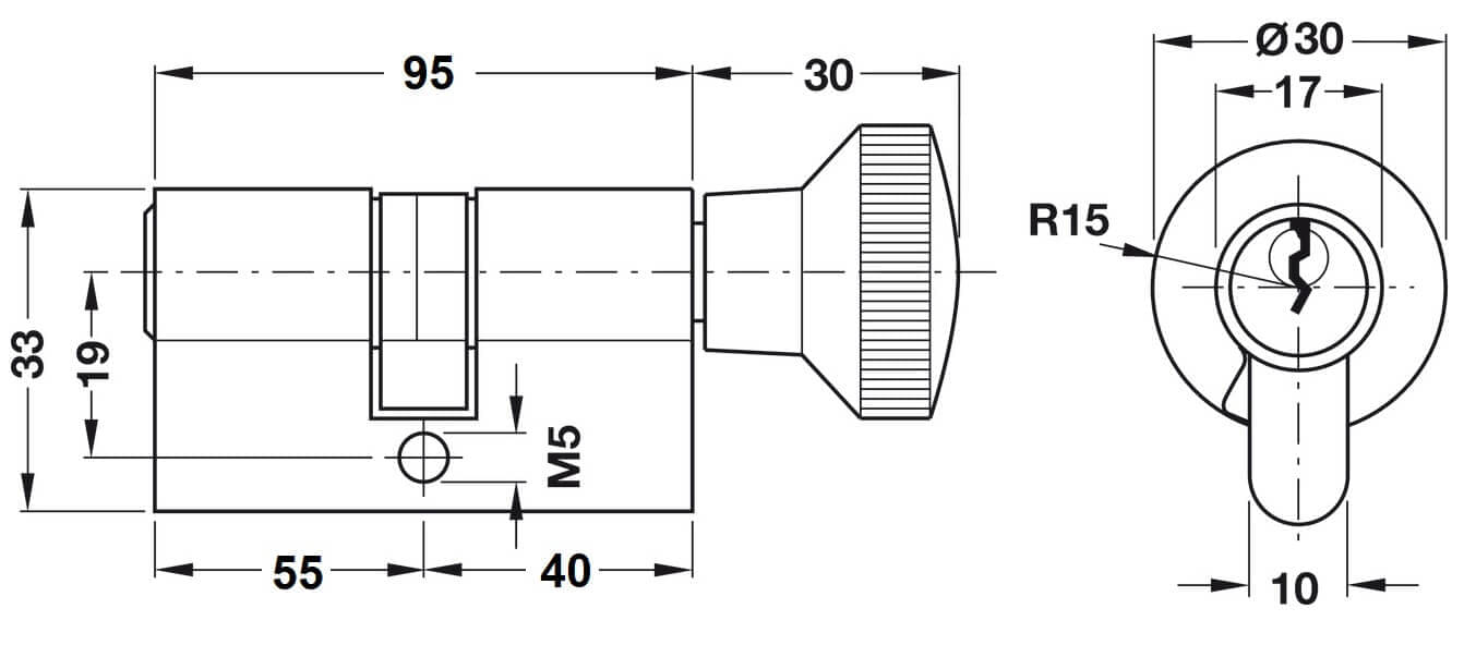 The cylinder measures 33 mm in height, the knob measures 30 mm in diameter and depth.