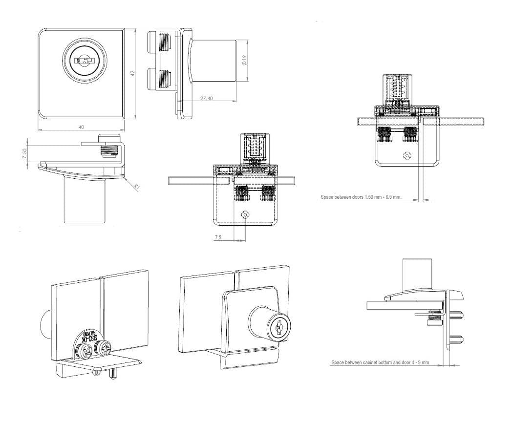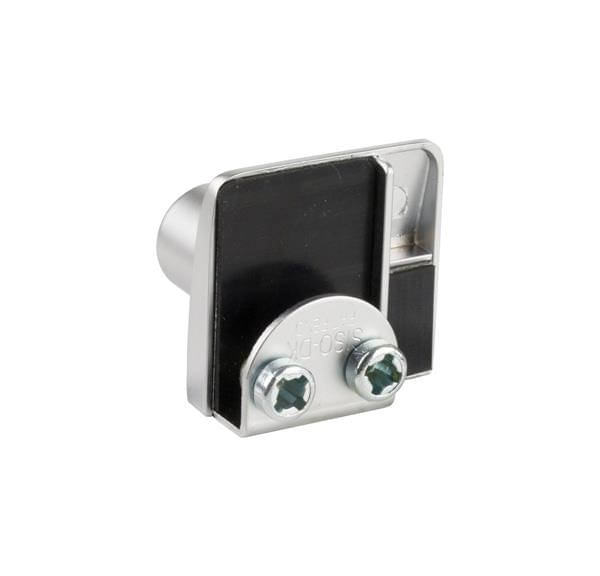 Glass door lock SQUARE for display cases and cabinets with double glass doors. Lock for glass thicknesses from 4 to 6 mm. Easy and fast installation for clamping with pre-mounted clamping screws.
