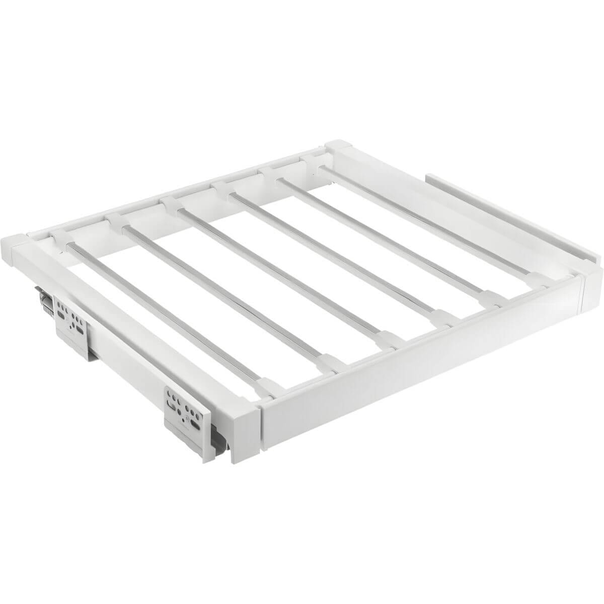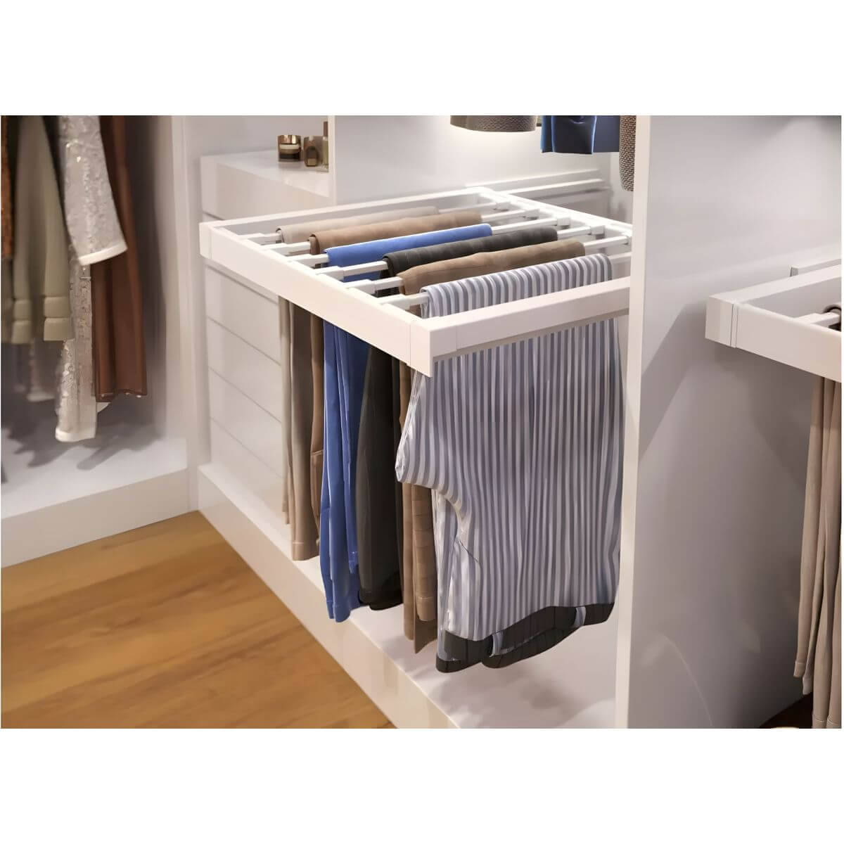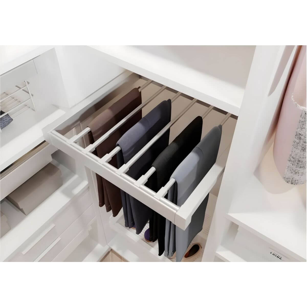 Soporte para pantalones extraíble ELITE de Gedotec, de acero blanco, profundidad del mueble mín. 500 mm, con guía de extracción con cierre suave - ancho del mueble 600 mm