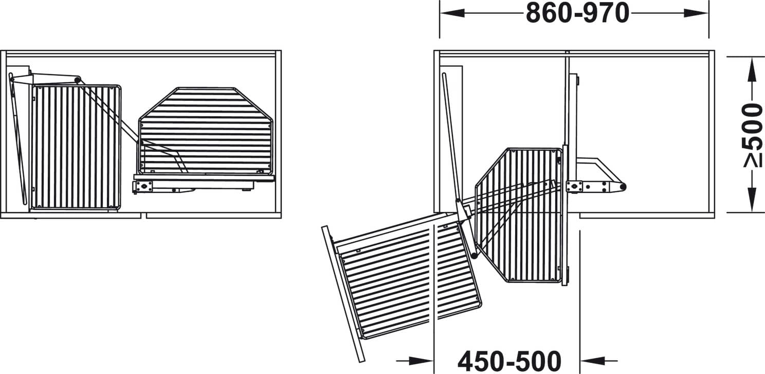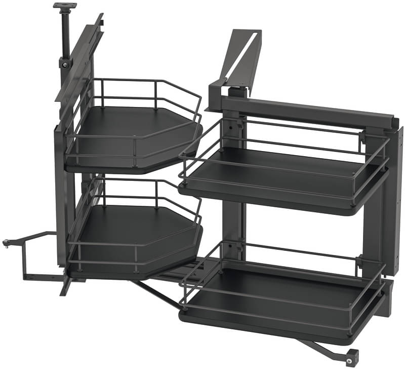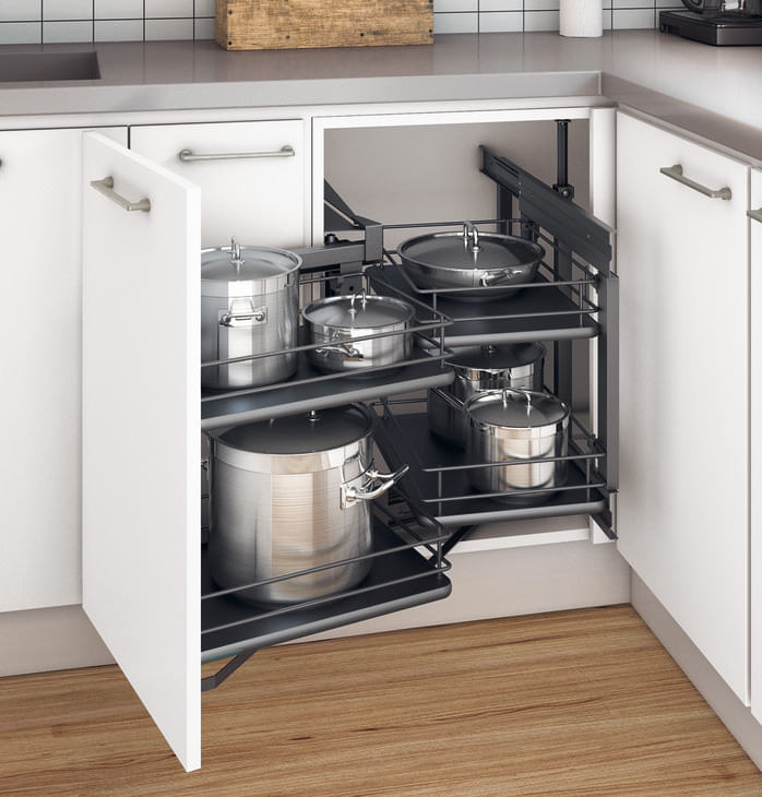 Calidad probada de la empresa Häfele para una máxima estabilidad y durabilidad. Para armarios de esquina inferiores de 900 x mínimo 495 mm. Movimiento guiado y amortiguado para un manejo suave y silencioso. Con dos niveles para mayor espacio de almacenamiento.