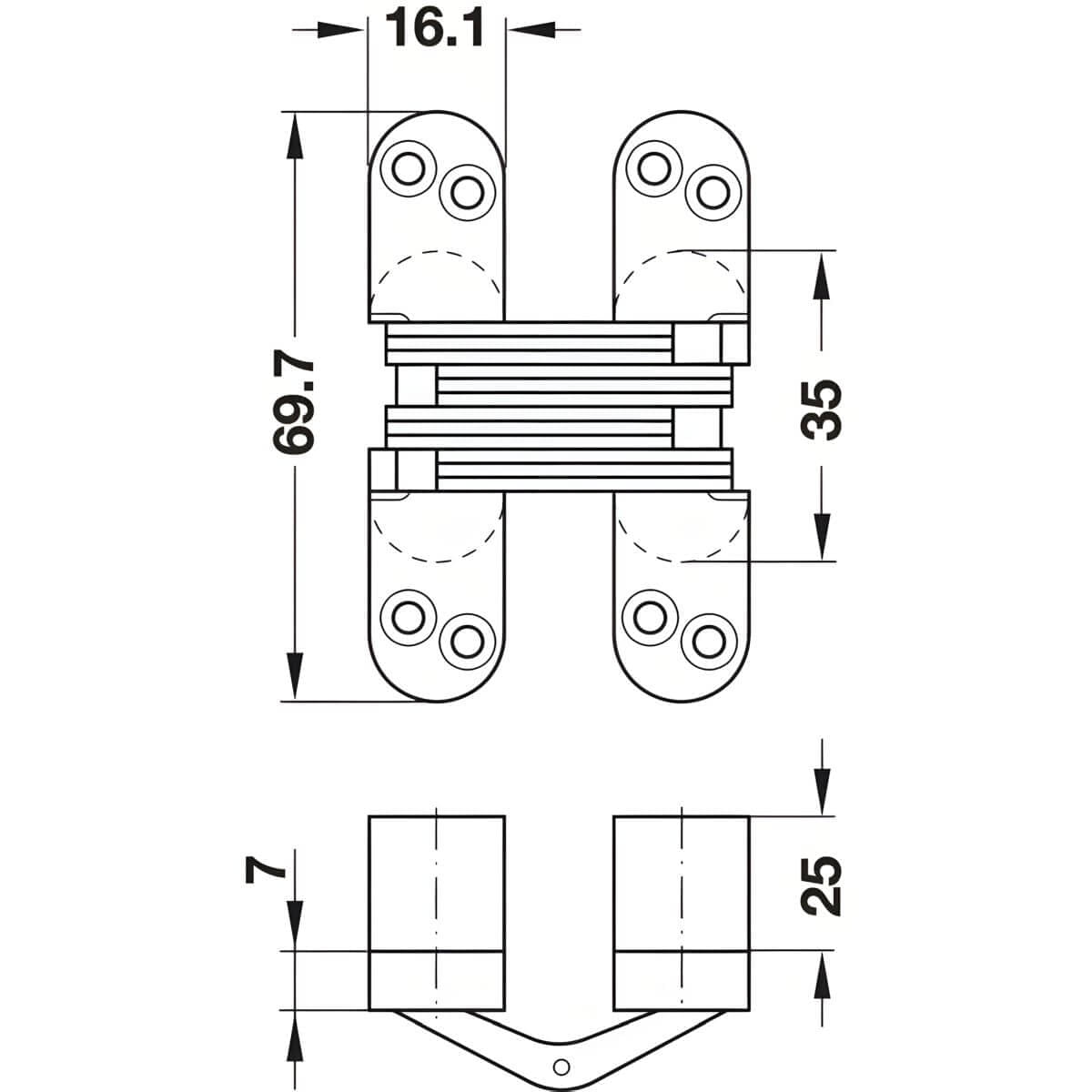 Bisagra de puerta metálica Soss para un tope invisible, latonada, grosor de madera de 13 a 51 mm