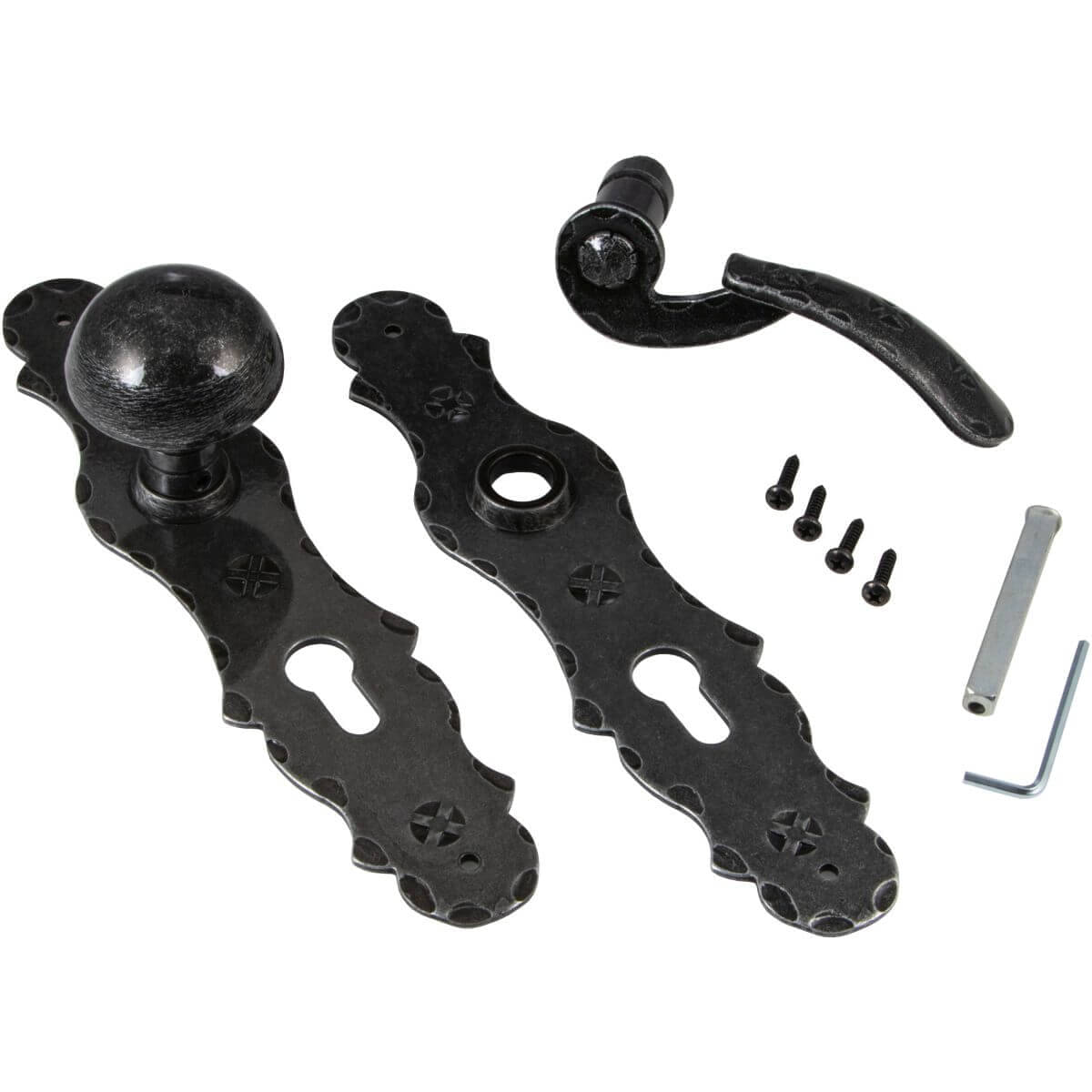 Este juego de manijas antiguas de placa larga está fabricado en hierro forjado macizo, lo que garantiza una larga durabilidad. Gracias al material de montaje suministrado, este juego de manijas para puertas se puede montar rápidamente y fácilmente, incluso para personas sin experiencia. No se forman depósitos antiestéticos y destaca por sus bordes y esquinas bien acabados en la manija de la puerta. Esto hace que este juego de manijas de placa larga sea ideal para puertas interiores en áreas de estar.