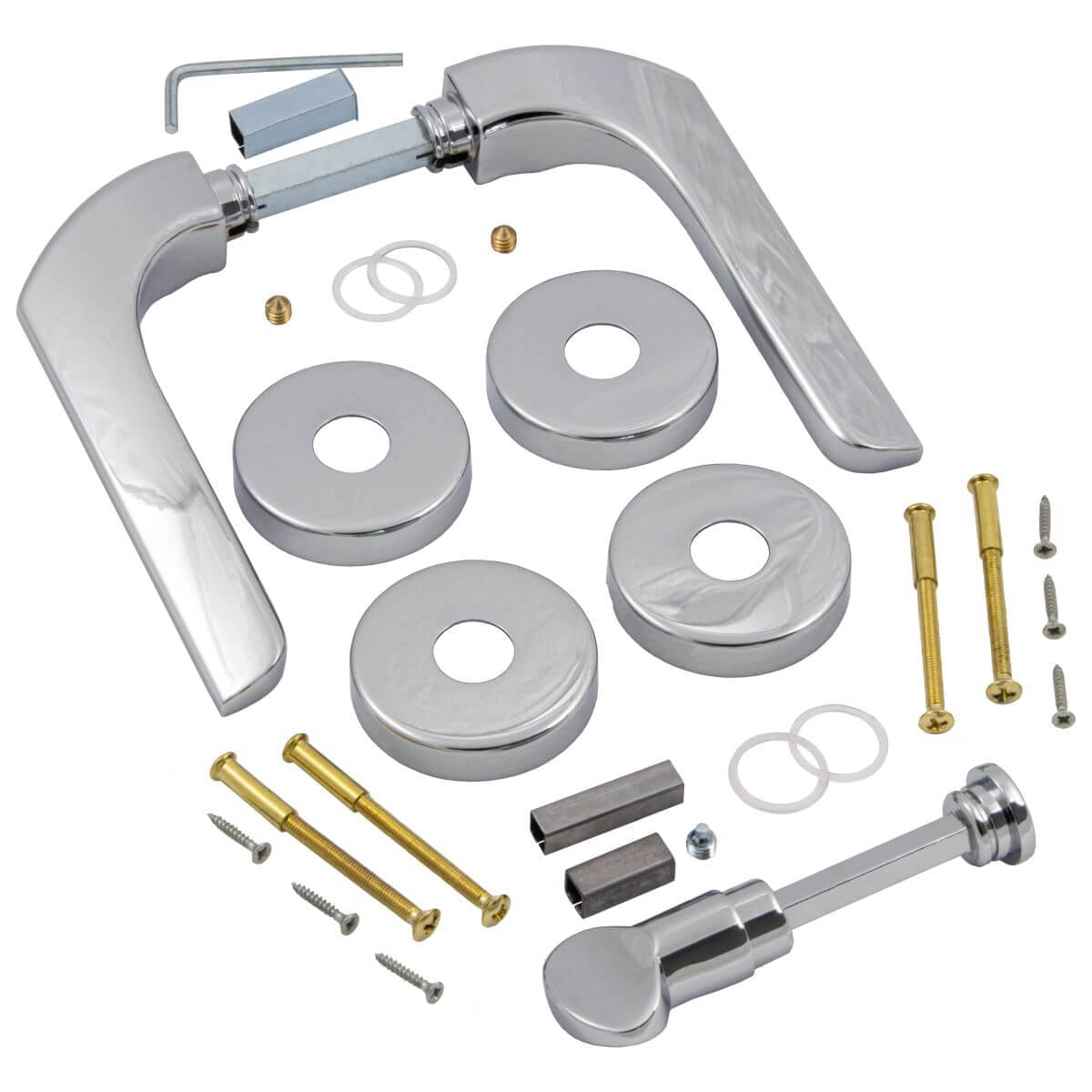 - 1 juego - Juego de manillas - (2 manillas de puerta, 2 rosetas redondas, 1 vástago cuadrado de 8 mm para espesores de puerta de 35-47 mm, 1 casquillo de compensación de 8 a 8,5 mm, 1 juego de tornillos)