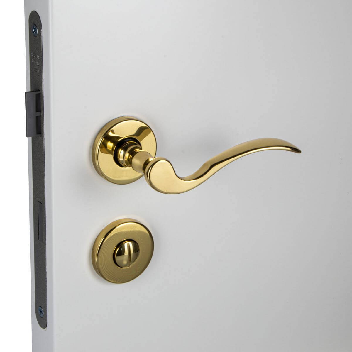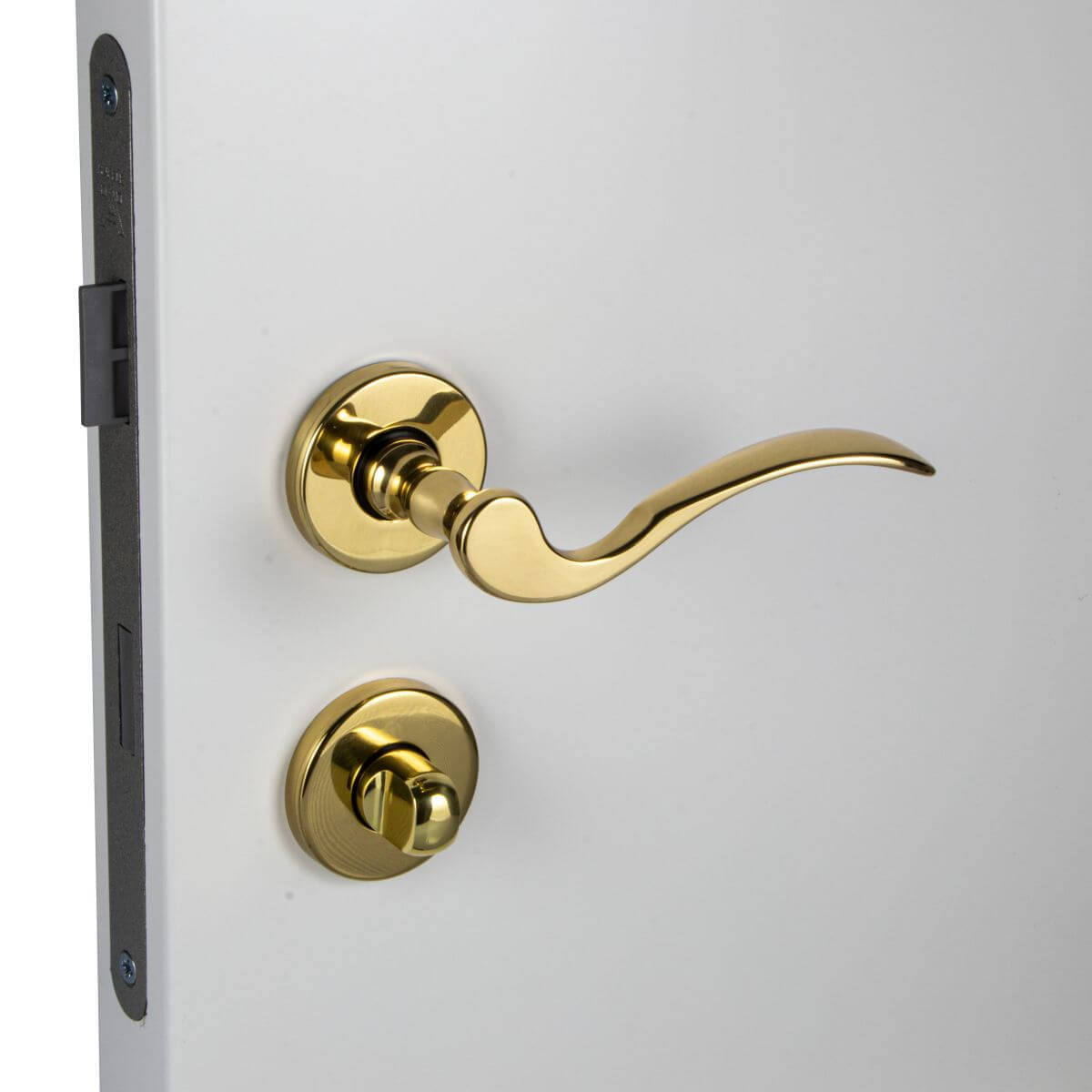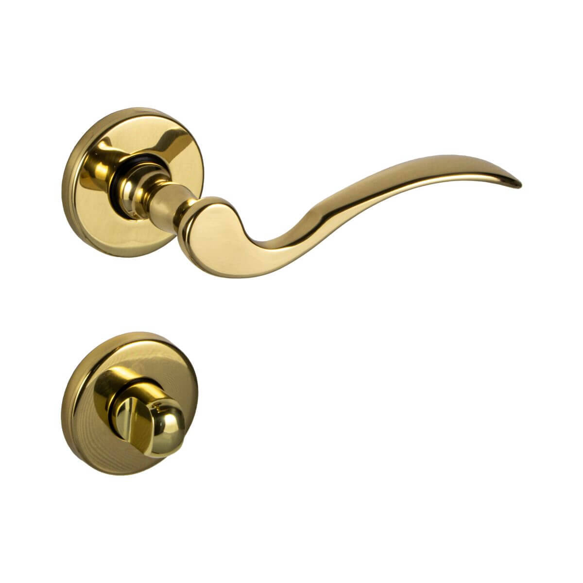 Manillas de puerta Fimet de alta calidad DUCK de latón macizo con revestimiento de diseño italiano. Los tiradores de puerta curvados en estilo vintage antiguo le dan un toque especial a cada puerta. Juego de manillas de metal inoxidable en rosetas redondas para puertas interiores y puertas de habitaciones de madera. Herrajes de puerta con giro fijo y resorte de retorno.