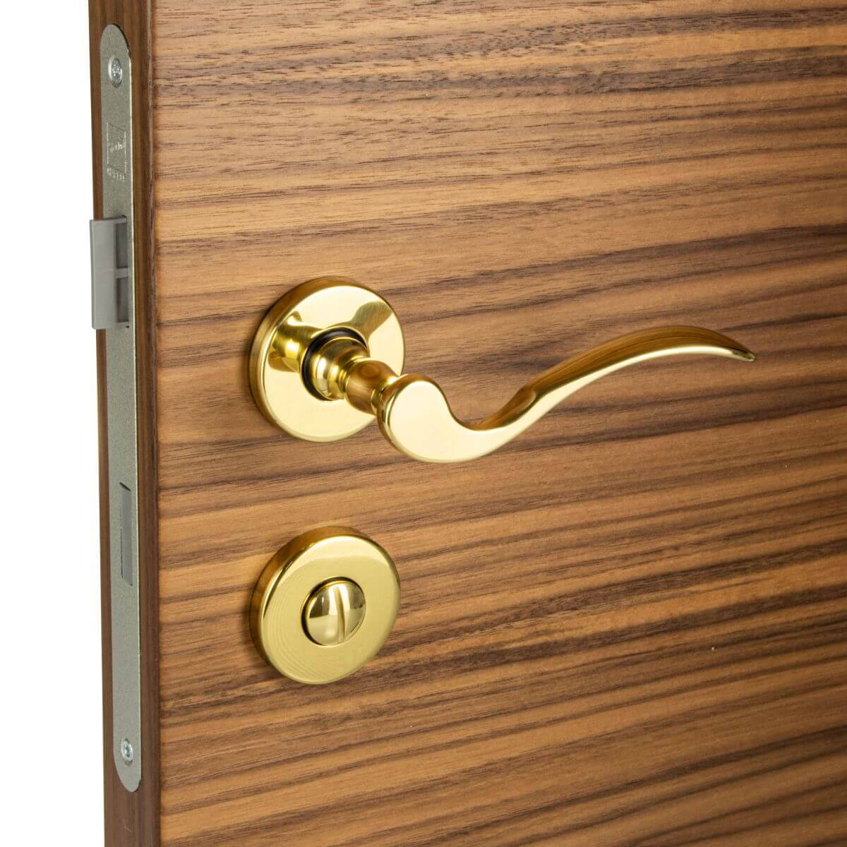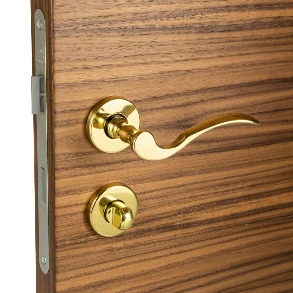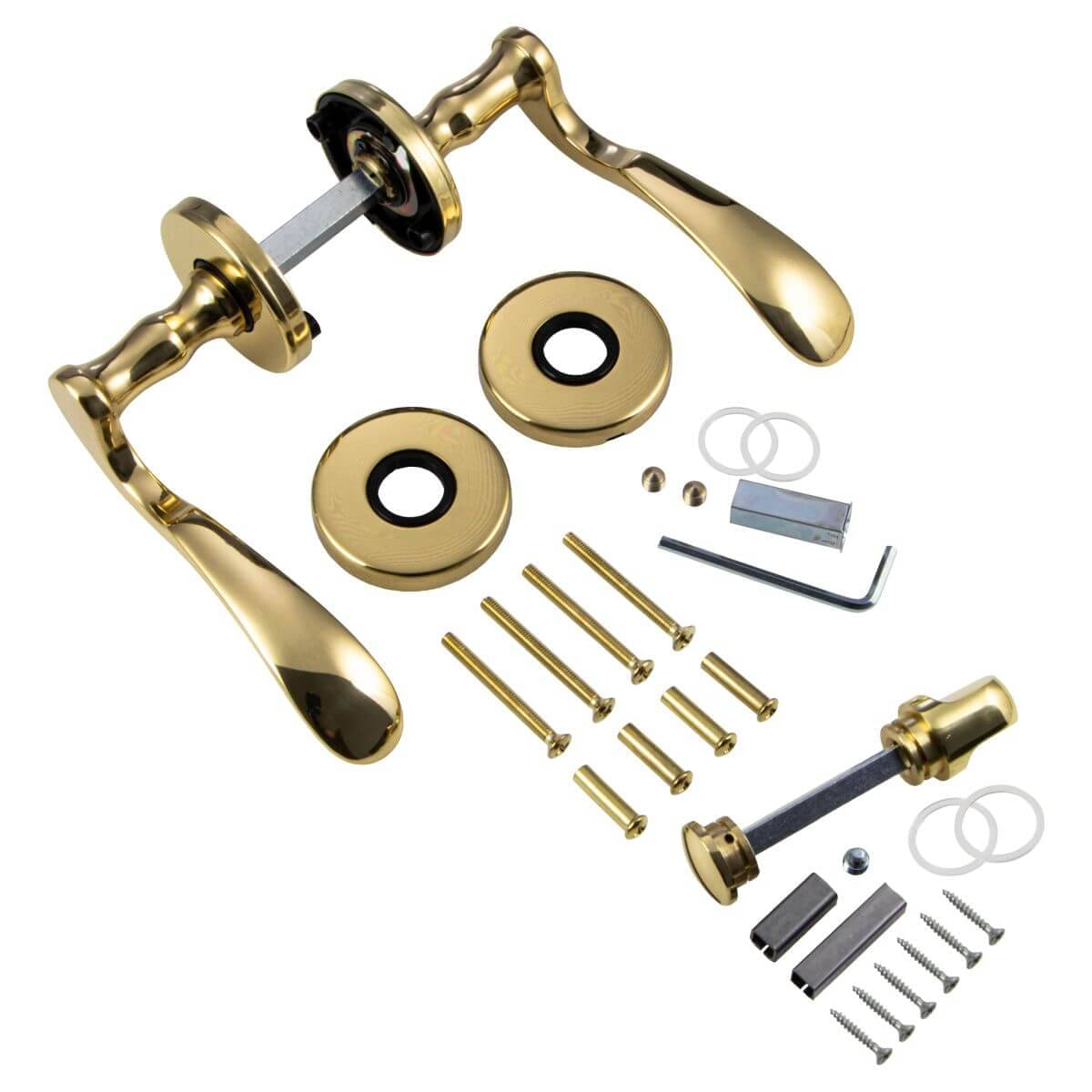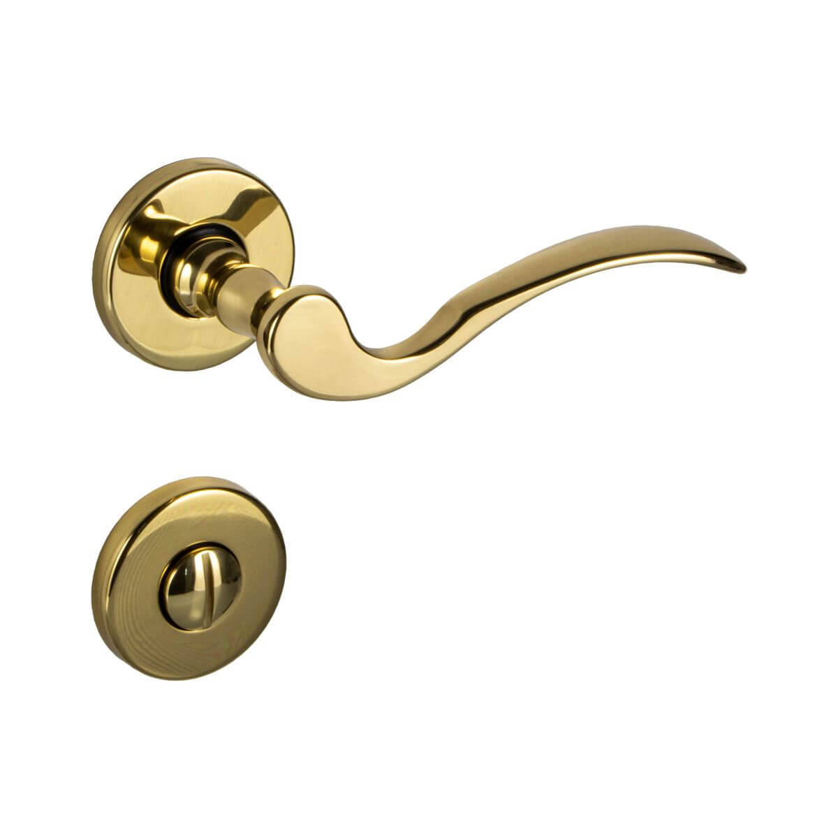 Manillas de puerta Fimet de alta calidad DUCK de latón macizo con revestimiento de diseño italiano. Los tiradores de puerta curvados en estilo vintage antiguo le dan un toque especial a cada puerta. Juego de manillas de metal inoxidable en rosetas redondas para puertas interiores y puertas de habitaciones de madera. Herrajes de puerta con giro fijo y resorte de retorno.