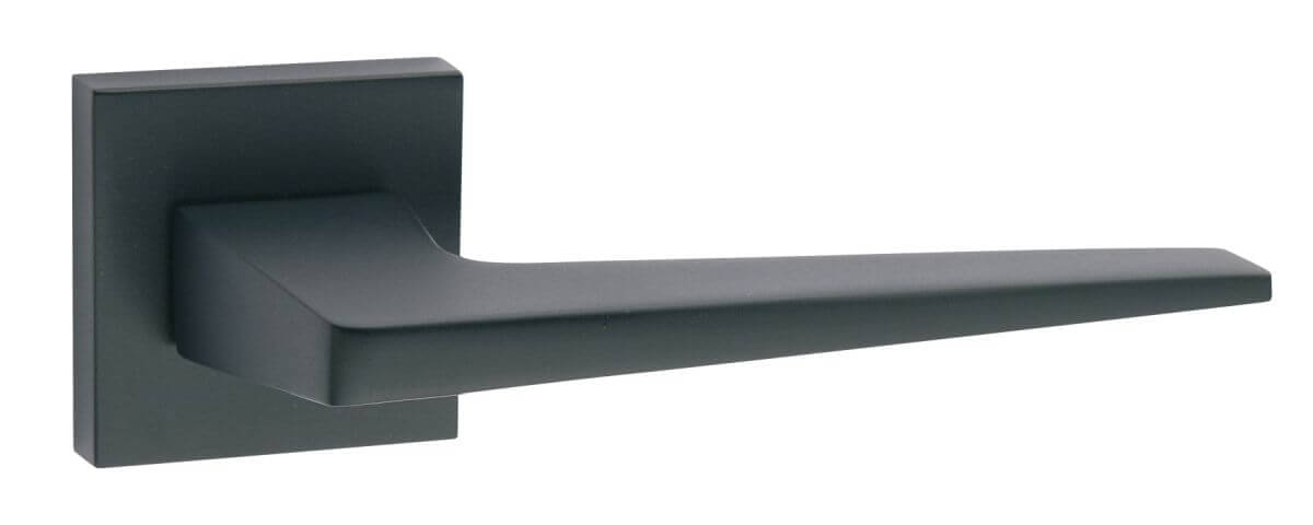 Juego de rosetas de alta calidad Fimet FLAKE de latón con recubrimiento de diseño de tendencia italiana en cromo satinado. Los atractivos tiradores de puerta en estilo moderno y atemporal le dan ese toque especial a cada puerta. Juego de manija de puerta sin óxido en rosetas cuadradas para puertas interiores y puertas de madera. Herraje de puerta montado rígidamente giratorio con resorte de retorno.