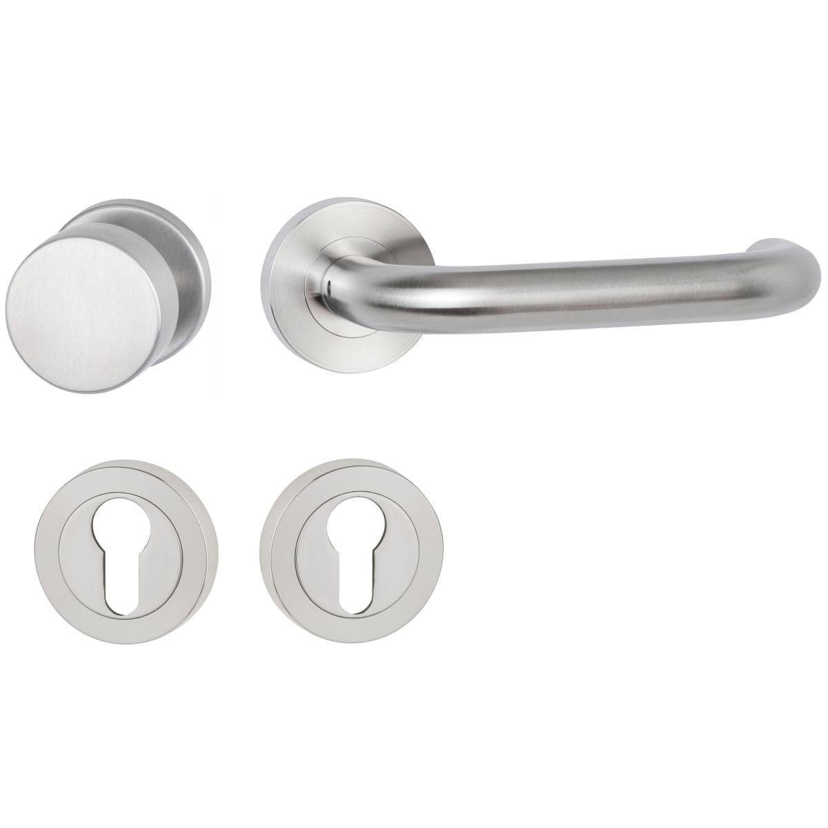 - 1 JUEGO - juego de manillas - (2 manillas de puerta incl. rosetas, 2 rosetas de llave incl. tapas de cierre, 1 husillo cuadrado de 8 mm para grosor de puerta de 38 - 45 mm, 1 casquillo de compensación de 8 a 8,5 mm, 1 juego de tornillos)