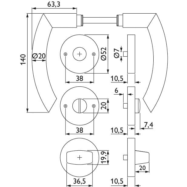 - 1 JUEGO - juego de manillería - (2 manillas incl. rosetas, 2 rosetas de llave incl. tapas, 1 husillo cuadrado de 8 mm para grosor de puerta de 38 - 42 mm, 1 casquillo de compensación de 8 a 8,5 mm, 1 juego de tornillos)