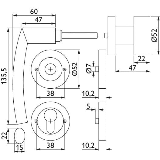 - 1 SET - juego de manillería - (2 manillas incl. rosetas, 2 rosetas de llave incl. tapas, 1 husillo cuadrado 8 mm para grosor de puerta 38 - 45 mm, 1 casquillo de nivelación de 8 a 8,5 mm, 1 juego de tornillos)