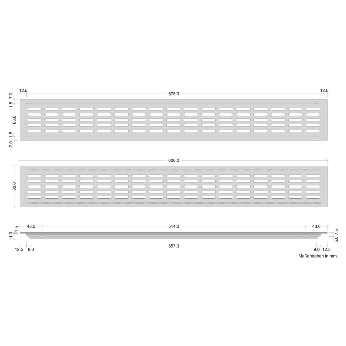La grille d'aération haut de gamme de Gedotec séduit par sa finition de première qualité, son design moderne et sa fonctionnalité maximale. Fabriquée en aluminium robuste, cette grille de chauffage offre une solution durable et inoxydable pour une circulation efficace de l'air dans les espaces de vie et de travail. Grâce à ses lames aux bords facettés élégants et à ses perforations précises de 40 x 7,5 mm, la grille d'aération assure non seulement une ventilation optimale derrière les meubles, mais apporte également une touche esthétique à chaque pièce.