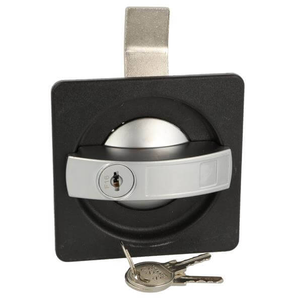 Poignée pivotante durable Siso en plastique et métal avec cylindre de verrouillage intégré et 2 clés correspondantes. Mécanisme de verrouillage simple avec entaille pivotante et angle de fermeture à visser, idéal pour une utilisation dans une caravane, un camping-car, un véhicule de camping, une remorque ou pour des casiers et des vestiaires.