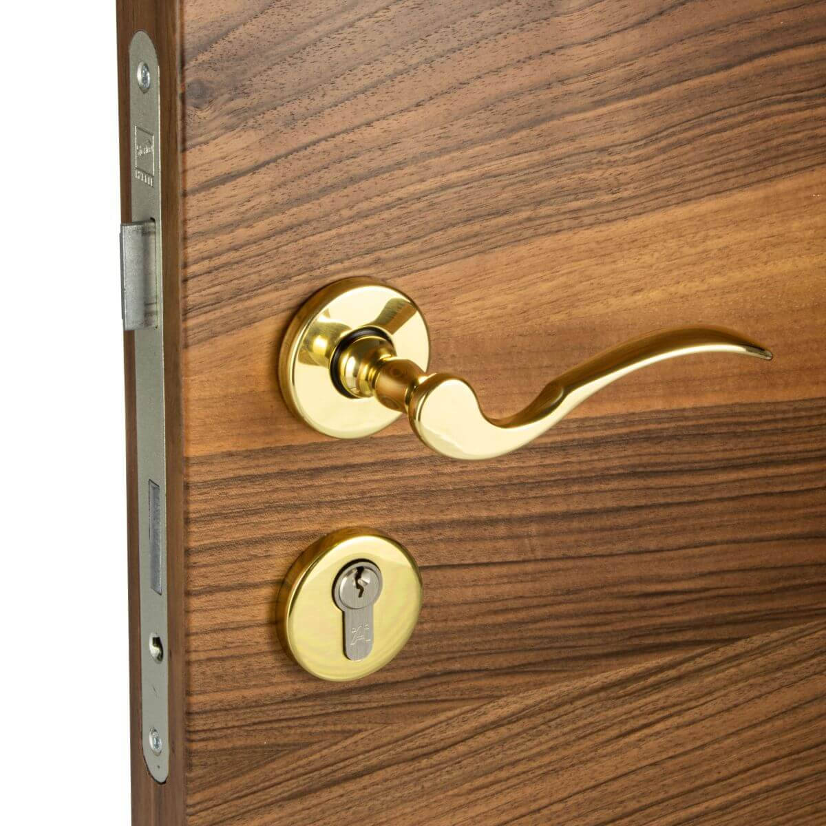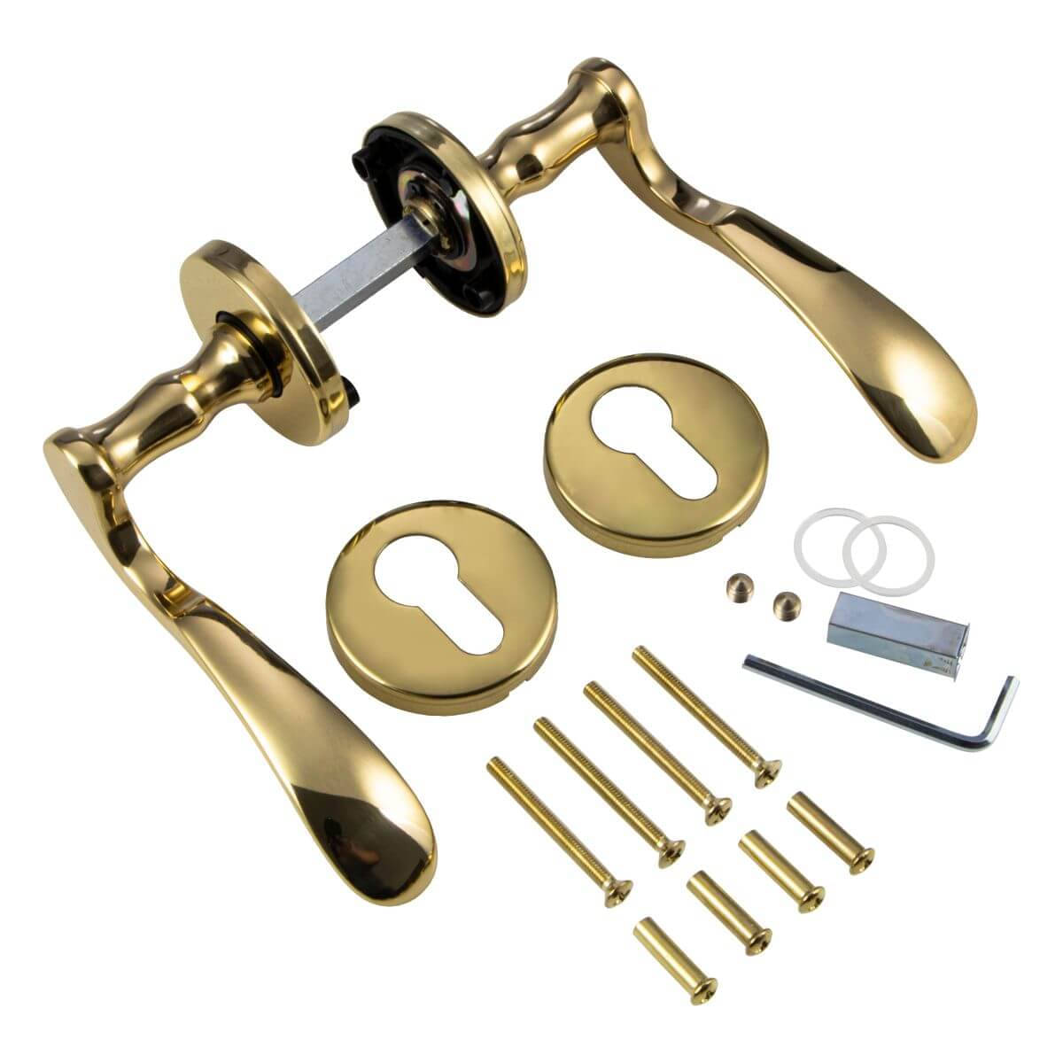 Poignées de porte haut de gamme Fimet DUCK en laiton massif avec revêtement de tendance italienne. Les poignées de porte courbées dans un style vintage antique donnent à chaque porte quelque chose d'unique. Ensemble de poignées résistant à la rouille avec rosaces rondes pour portes intérieures et portes de chambre en bois. Les poignées de porte sont fermement pivotantes et équipées d'un ressort de rappel.