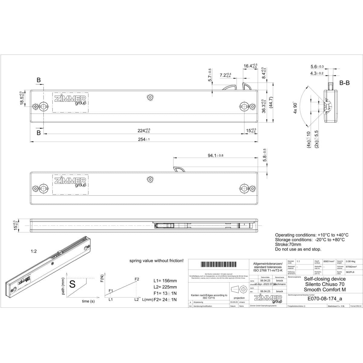 Das Dämpfungs-Set ist robust konstruiert und auf maximale Funktionalität ausgelegt. Das zweiteilig geschraubte Gehäuse aus PPT20 in grau RAL7035 gewährleistet Stabilität, während der Freilauf eine geschmeidige Bedienung auch ohne vollständige Auslösung ermöglicht. Der Rasthebel Typ S besteht aus hochwertigem Polyketon in Naturfarbe und harmoniert optimal mit der langlebigen Feder aus EN-10270-Stahl, die mit Kräften von 13 N (F1) und 24 N (F2) eine präzise, kontrollierte Schließbewegung unterstützt.