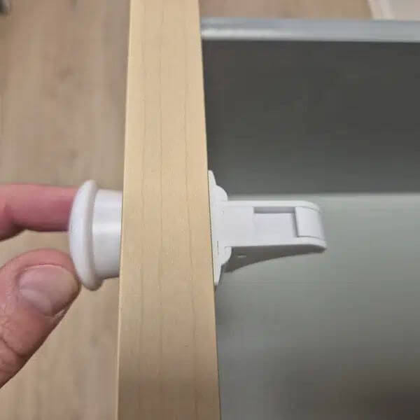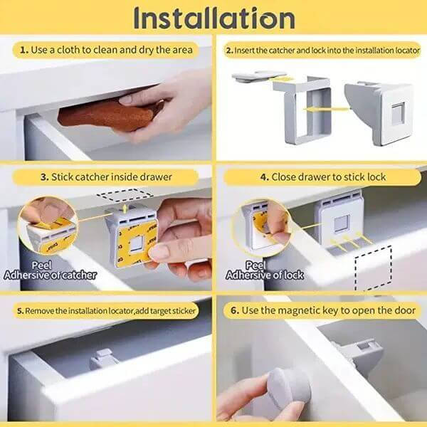 Dank der innovativen, selbstklebenden Montage mit starkem 3M-Klebeband lässt sich die Kindersicherung schnell und ganz ohne Bohren oder Schrauben anbringen. Die praktische Montagehilfe erleichtert die Installation zusätzlich und sorgt für eine präzise Positionierung. Besonders hervorzuheben ist das unsichtbare Design: Die Sicherung wird im Inneren von Schrank oder Schublade angebracht und bleibt von außen vollkommen verborgen – perfekt für ein aufgeräumtes und modernes Wohnbild.