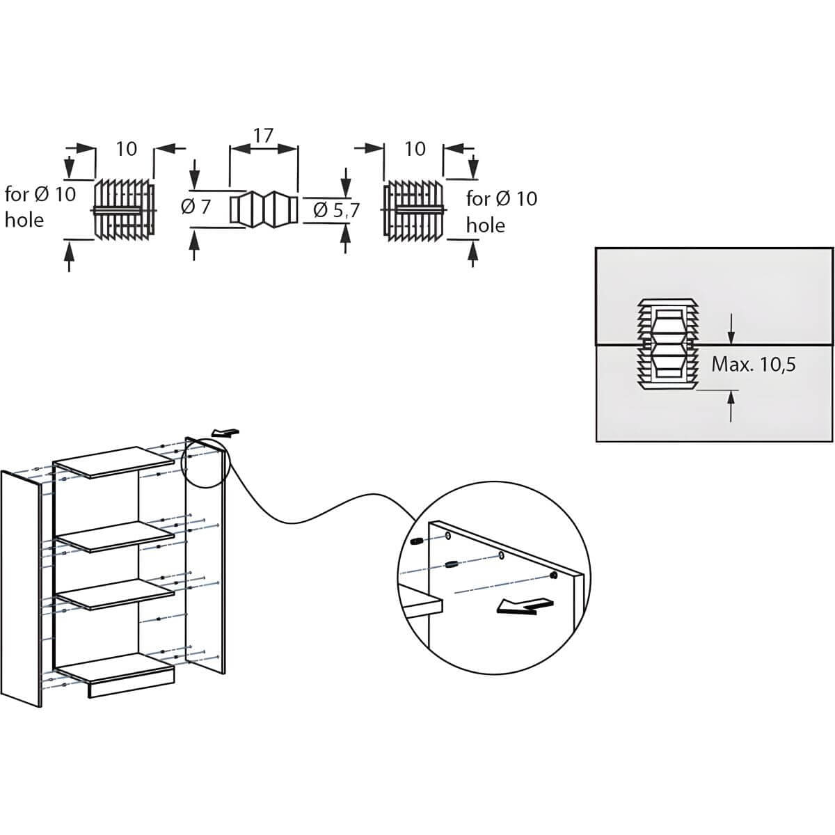 BONE ist für ein Bohrloch mit 10 mm Durchmesser ausgelegt und ermöglicht eine maximale Einbautiefe von 10,5 mm. Dadurch lässt sich der Verbinder platzsparend und sauber in das Werkstück integrieren, ohne die Stabilität oder Optik zu beeinträchtigen. Besonders im Möbelbau sorgt der Verbinder für eine sichere Verbindung von Bauteilen und unterstützt eine dauerhafte, belastbare Konstruktion.