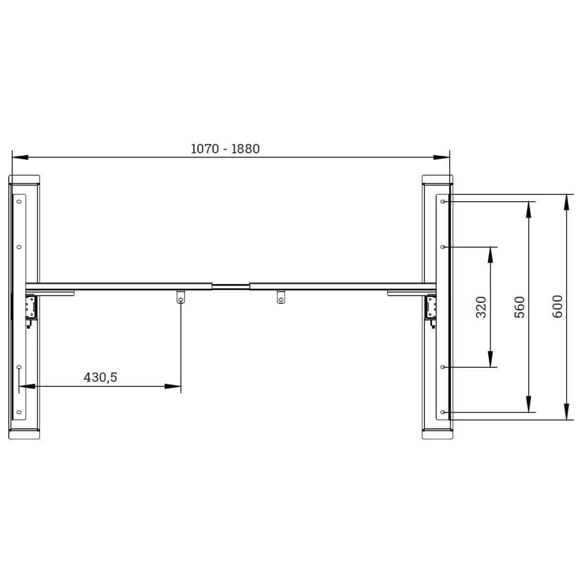 Dank der Teleskop-Längenverstellung von 1070 bis 1880 mm passt sich das Gestell flexibel an unterschiedliche Tischplattenformate an. Unterstützt werden Plattengrößen von mindestens 600 x 1070 mm bis maximal 1000 x 2200 mm. Das Rastermaß von 20 mm ermöglicht eine präzise Anpassung an individuelle Anforderungen. Mit einer Belastbarkeit von bis zu 80 kg bietet das Gestell ausreichend Stabilität für Monitore, Technik und Arbeitsmaterialien.
