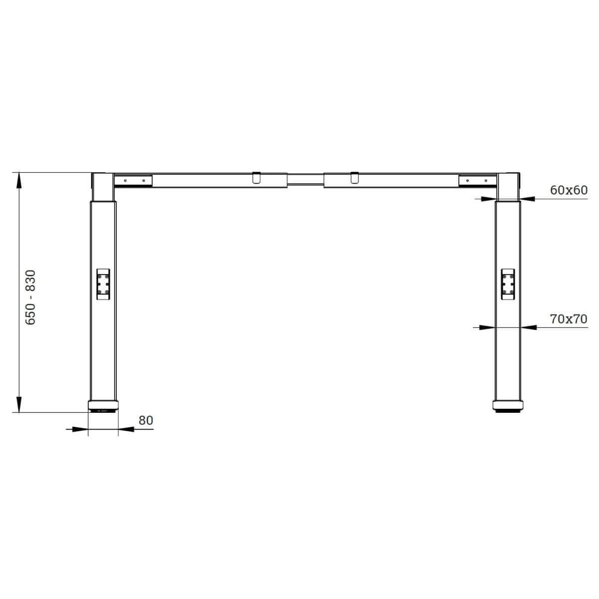 Die robuste Konstruktion mit zwei Säulensegmenten sorgt für eine gleichmäßige Höhenverstellung und hohe Stabilität im täglichen Einsatz. Die quadratischen Hubsäulen mit 70 x 70 mm sowie die stabile T-Fuß-Konstruktion verleihen dem Tischgestell eine moderne Optik und gewährleisten gleichzeitig einen sicheren Stand.