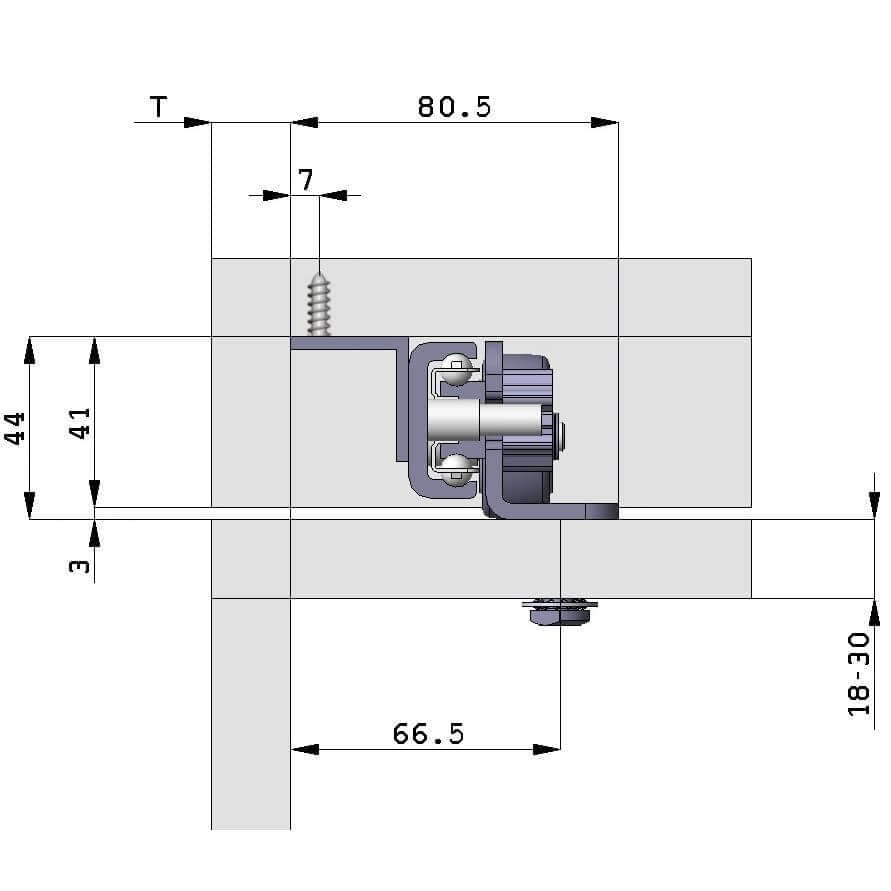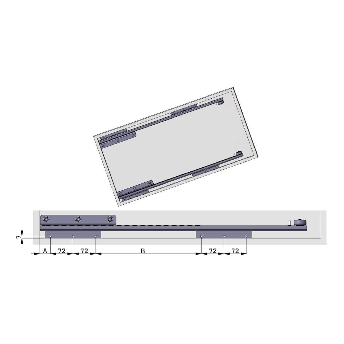 Die Montage gestaltet sich schnell und unkompliziert. Die Befestigung erfolgt auf dem Trägerboden für eine aufliegende, verschiebbare Arbeitsplatte. Der erforderliche Innenabstand zwischen Trägerbasis und beweglicher Platte beträgt lediglich 44 mm, wodurch das System besonders platzsparend integriert werden kann. Bei einer diagonal geplanten Verschiebung ist zusätzlich die Montage seitlicher Stützen für die Laufschienen erforderlich, die nicht im Lieferumfang enthalten sind.