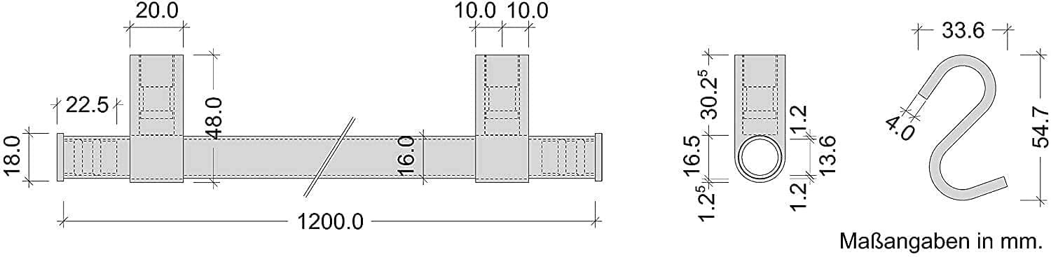 - 1 Set - Küchenreling (1x Relingrohr, 2x Endstück, 2x Relingrohrhalter, 5x S-Haken, Schrauben und Dübel)