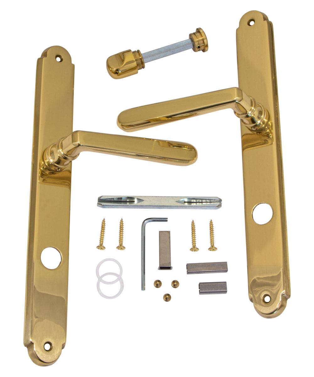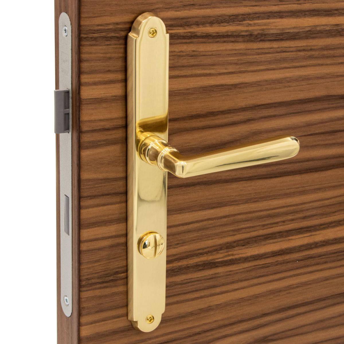 Hochwertige Fimet Langschildgarnitur ALT WIEN mit polierter Messing-Oberfläche. Ansprechende Design Drückergarnitur aus massivem Messing mit integrierter Hochhaltefeder / Rückholfeder. Exklusiver Vintage Türbeschlag fest drehbar gelagert für Zimmertüren und Innentüren. Maße: Schild: Breite: 33 - Länge: 254 mm - Höhe: 8 mm - Drückerlänge: 118 mm - Türdrücker für Türstärke 38-60 mm inkl. Befestigungsmaterial - Ausführung in DIN-Norm (Deutsche Innentürnorm)