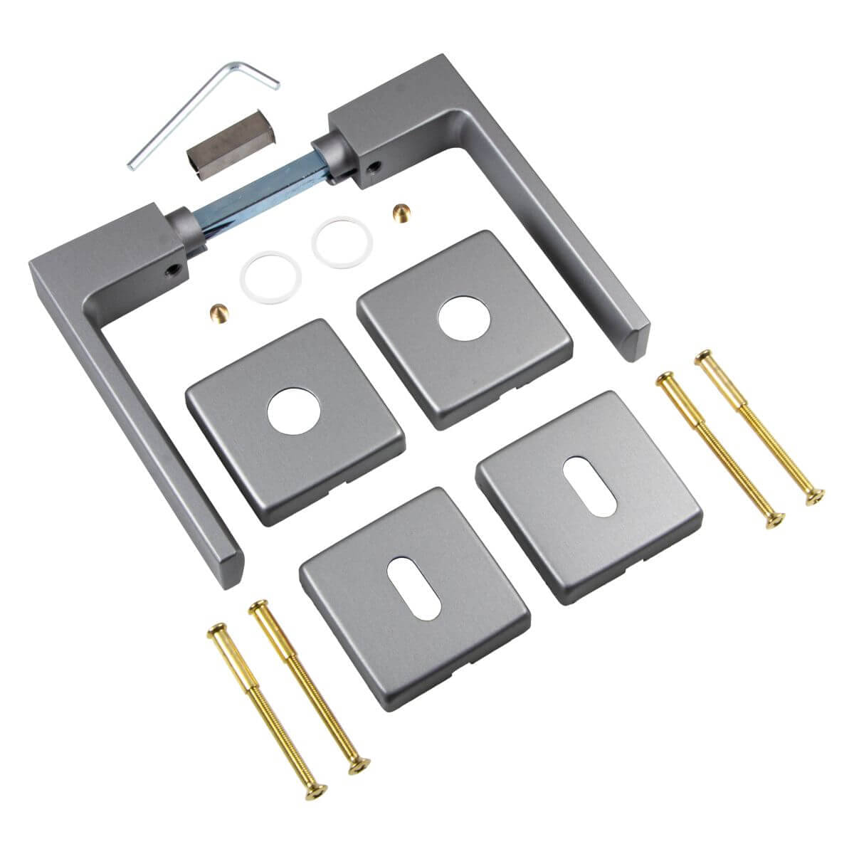 - 1 SET - Drückergarnitur - (2 Türgriffe inkl. Rosetten, 2 Schlüsselrosetten inkl. Abdeckkappen, 1 Vierkantstift 8 mm für Türstärke 35 - 47 mm, 1 Ausgleichshülse von 8 auf 8,5 mm, 1 Satz Schrauben)