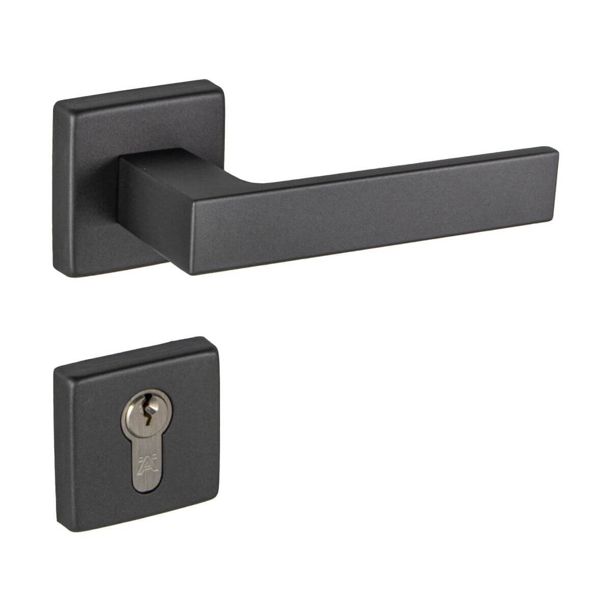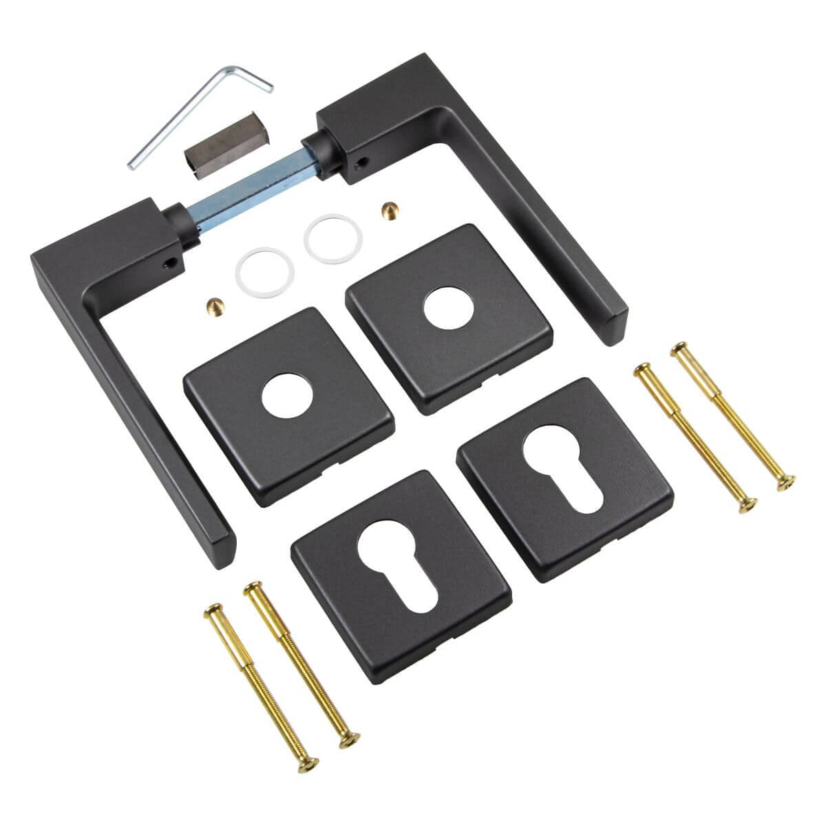 - 1 SET - Drückergarnitur - (2 Türgriffe inkl. Rosetten, 2 Schlüsselrosetten inkl. Abdeckkappen, 1 Vierkantstift 8 mm für Türstärke 35 - 47 mm, 1 Ausgleichshülse von 8 auf 8,5 mm, 1 Satz Schrauben)