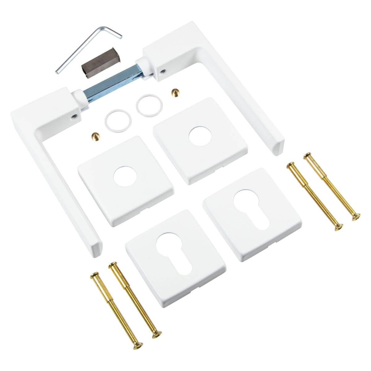 - 1 SET - Drückergarnitur - (2 Türgriffe inkl. Rosetten, 2 Schlüsselrosetten inkl. Abdeckkappen, 1 Vierkantstift 8 mm für Türstärke 35 - 47 mm, 1 Ausgleichshülse von 8 auf 8,5 mm, 1 Satz Schrauben)