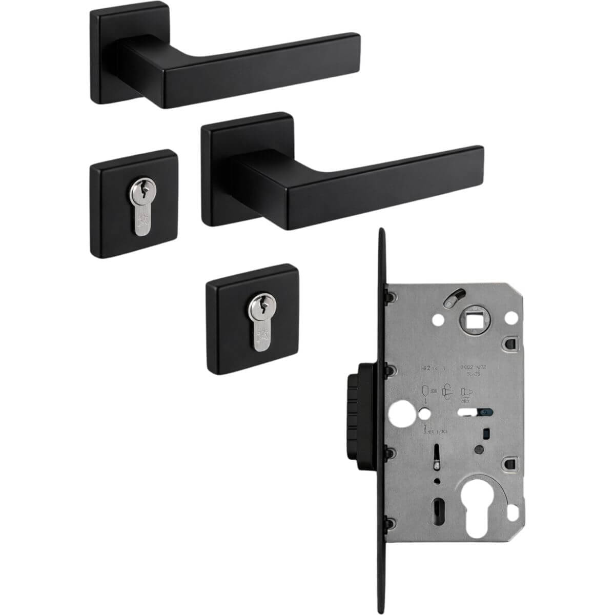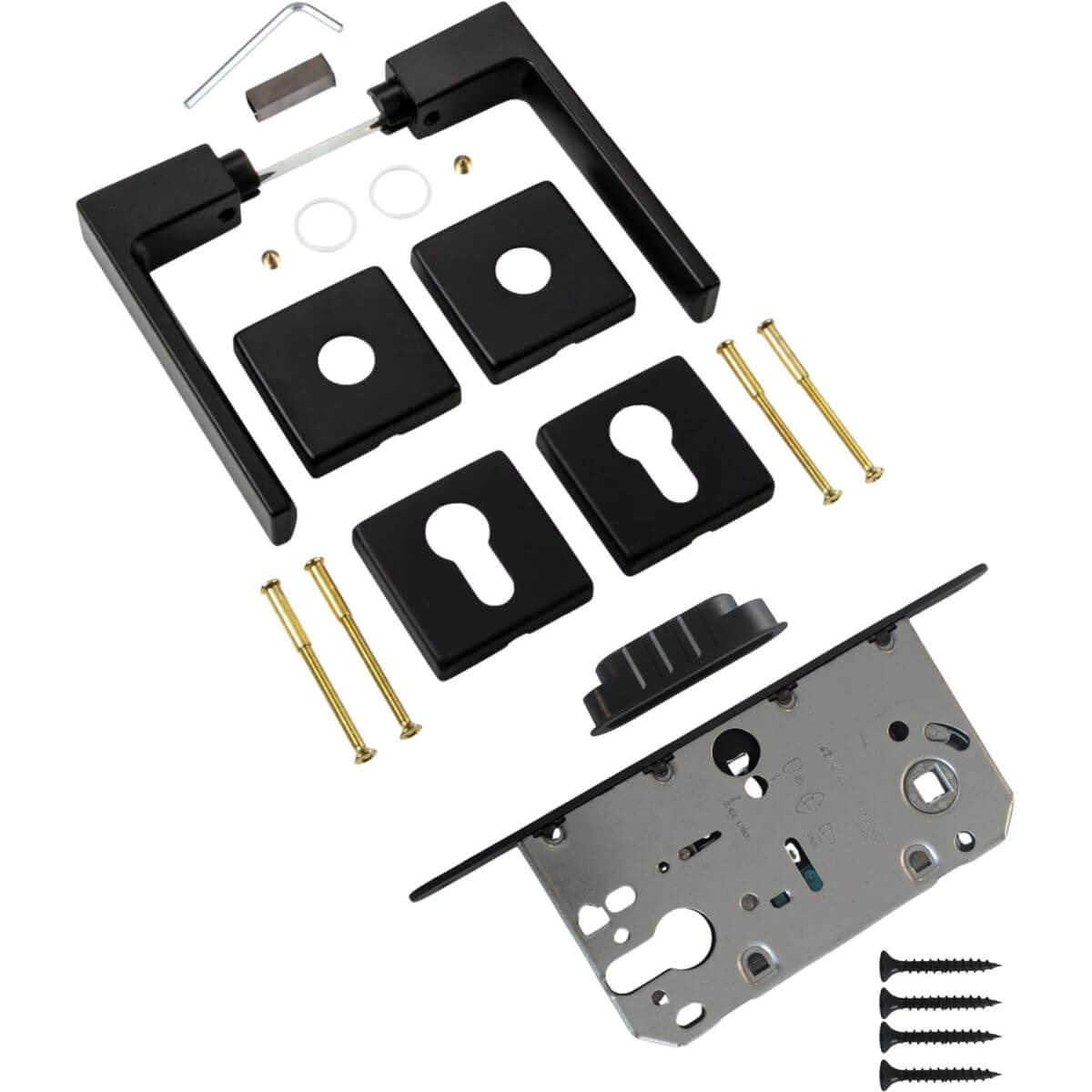 - 1 Set - Drückergarnitur - (2 Türgriffe inkl. Rosetten, 2 Schlüsselrosetten inkl. Abdeckkappen, 1 Vierkantstift 8 mm für Türstärke 35 - 47 mm, 1 Ausgleichshülse von 8 auf 8,5 mm, 1 Satz Schrauben)